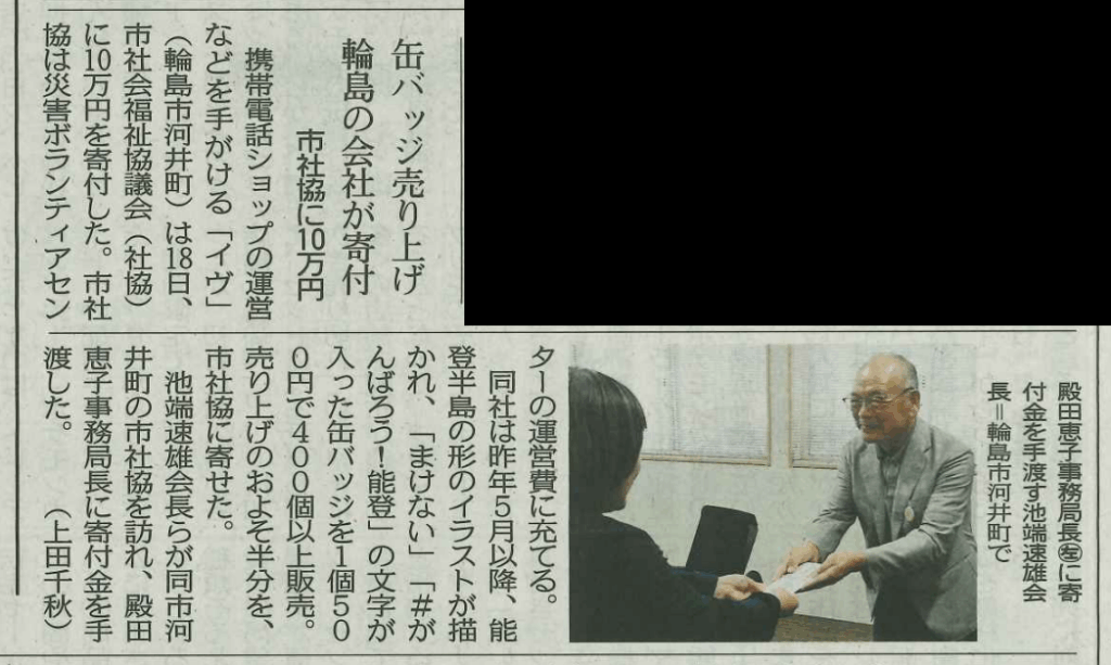 2025.8.18 収益を寄付させていただきました。 2025年8月19日 投稿者:kawaguchi 未分類 令和7年8月18日、輪島市社会福祉協議会様に復興祈願缶バッジの収益から10万円を寄付させていただきました。 北陸中日新聞 8月18日朝刊